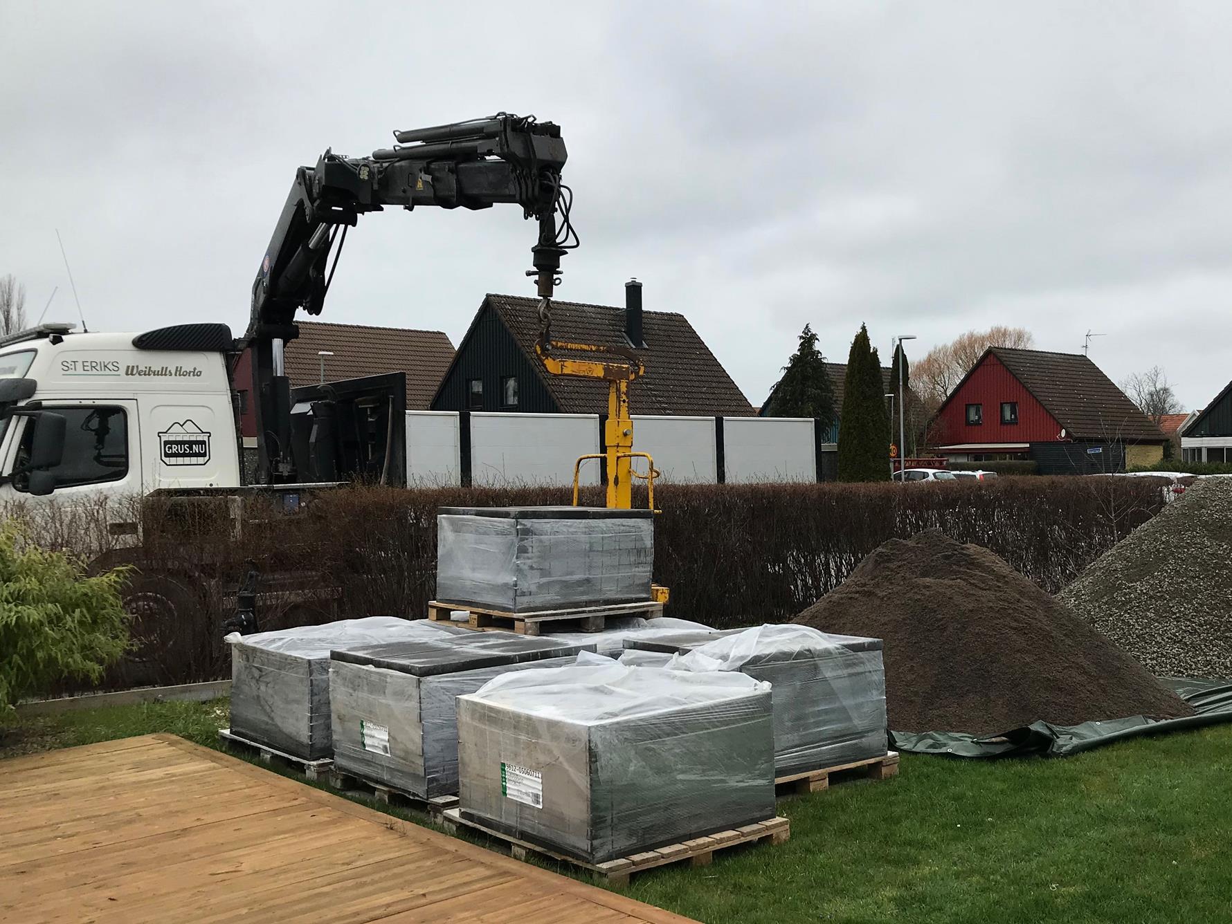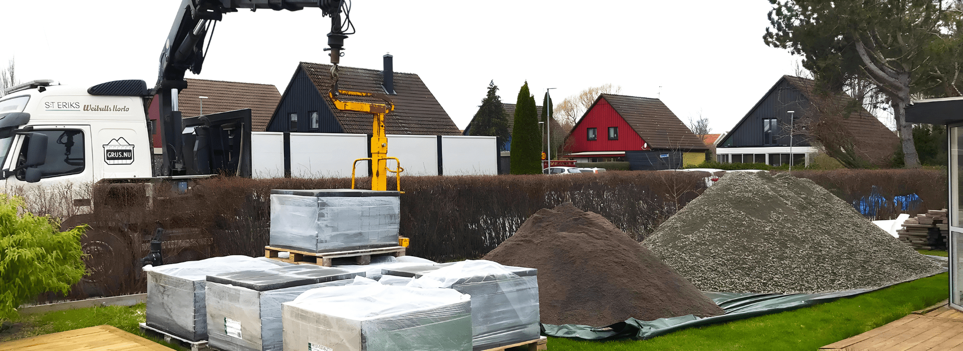 Vi har många års erfarenhet av plattor, marksten och mursten tillsammans det material och de produkter som behövs för att ditt projekt ska bli lyckat – allt ifrån singel och makadam till rullgräs och olika typer av jord. Vi är störst i Skåne på leveranser av färdigt gräs på rulle. Vi äger våra egna lastbilar och kan därför erbjuda marknades bästa fraktpriser, det kan skilja flera 1000 kr i fraktkostnad mellan oss och våra kollegor i branschen! På våra terminaler i Nordanå och Kävlinge får du råd och tips. Vi hjälper dig att lasta släpvagnen när du kommer till oss. Vi erbjuder leverans med tippbil eller kranbil inom hela Skåne.